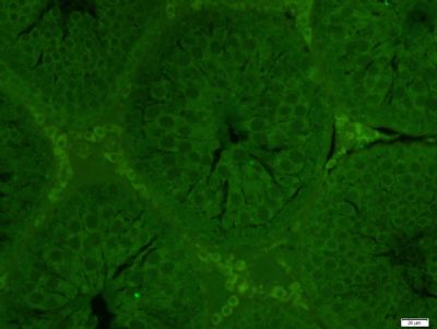 Paraformaldehyde-fixed, paraffin embedded (Rat testis); Antigen retrieval by boiling in sodium citrate buffer (pH6.0) for 15min; Block endogenous peroxidase by 3% hydrogen peroxide for 20 minutes; Blocking buffer (normal goat serum) at 37°C for 30min; Antibody incubation with (FAM46C) Polyclonal Antibody, Unconjugated (bs-8198R) at 1:400 overnight at 4°C, followed by a conjugated Goat Anti-Rabbit IgG antibody (bs-0295G-FITC) for 90 minutes, and DAPI for nuclei staining.