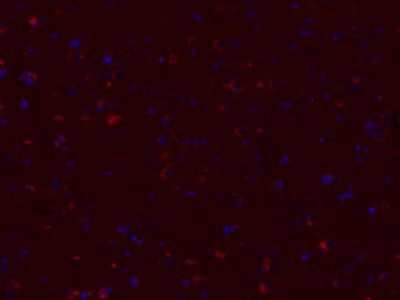 Paraformaldehyde-fixed, paraffin embedded (Human brain glioma); Antigen retrieval by boiling in sodium citrate buffer (pH6.0) for 15min; Block endogenous peroxidase by 3% hydrogen peroxide for 20 minutes; Blocking buffer (normal goat serum) at 37°C for 30min; Antibody incubation with (Bax) Monoclonal Antibody, Unconjugated (bsm-33283M) at 1:400 overnight at 4°C, followed by a conjugated Goat Anti-Mouse IgG antibody (bs-0296G-CY3) for 90 minutes, and DAPI for nuclei staining.