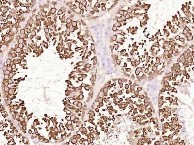 Paraformaldehyde-fixed, paraffin embedded (Mouse testis); Antigen retrieval by boiling in sodium citrate buffer (pH6.0) for 15min; Block endogenous peroxidase by 3% hydrogen peroxide for 20 minutes; Blocking buffer (normal goat serum) at 37°C for 30min; Antibody incubation with (HSP90 alpha) Monoclonal Antibody, Unconjugated (bsm-33212M-9E5) at 1:400 overnight at 4°C, followed by operating according to SP Kit(Mouse) (sp-0024) instructionsand DAB staining.