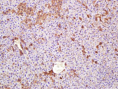 Paraformaldehyde-fixed, paraffin embedded (Mouse liver); Antigen retrieval by boiling in sodium citrate buffer (pH6.0) for 15min; Block endogenous peroxidase by 3% hydrogen peroxide for 20 minutes; Blocking buffer (normal goat serum) at 37°C for 30min; Antibody incubation with (G-CSF) Polyclonal Antibody, Unconjugated (bsm-10808M) at 1:400 overnight at 4°C, followed by a conjugated secondary antibody (sp-0023) for 20 minutes and DAB staining.